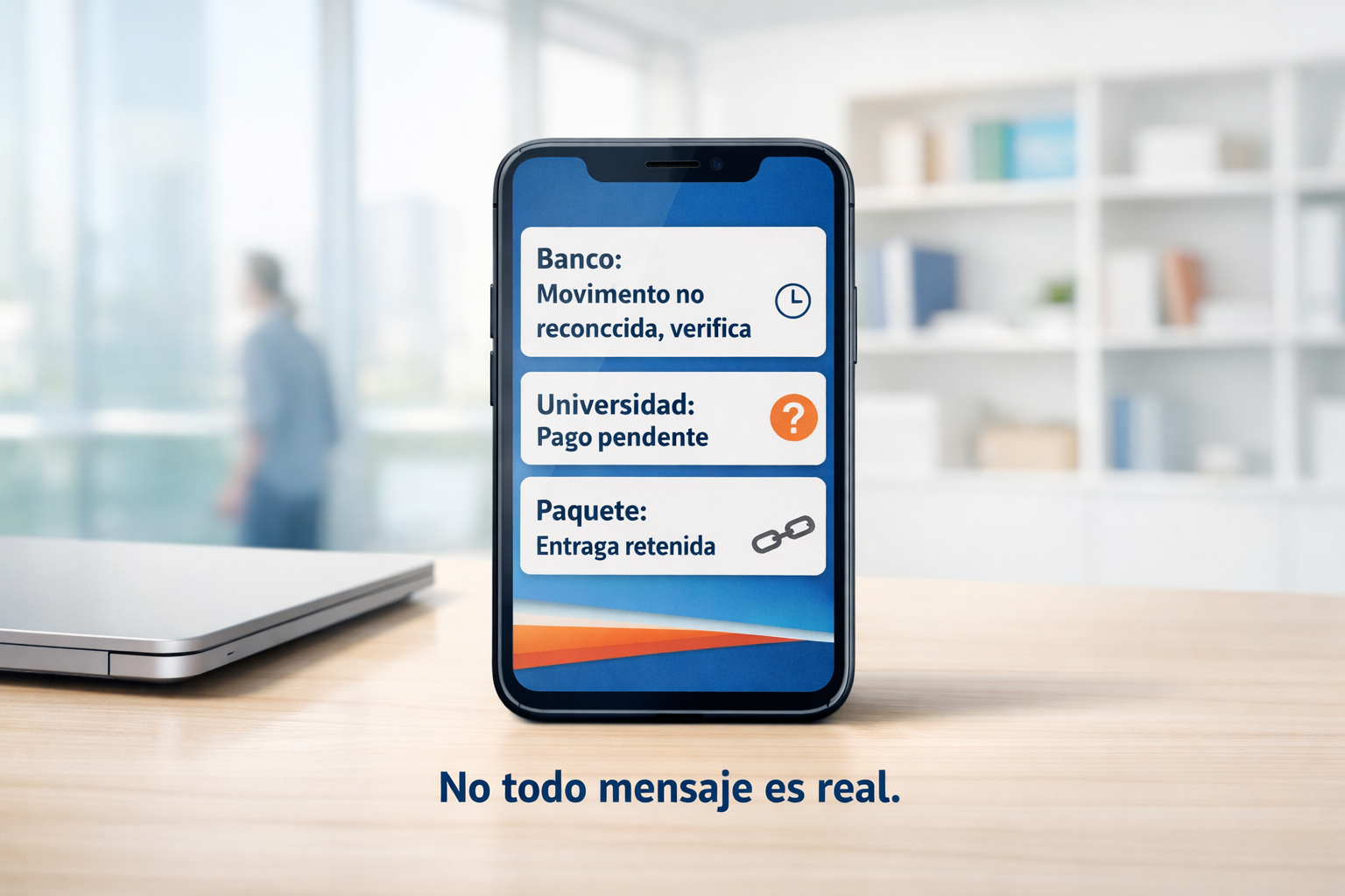 Capa 1: lo que ves. Un aviso urgente, un enlace, un número que llama, un mensaje que parece venir de alguien conocido.