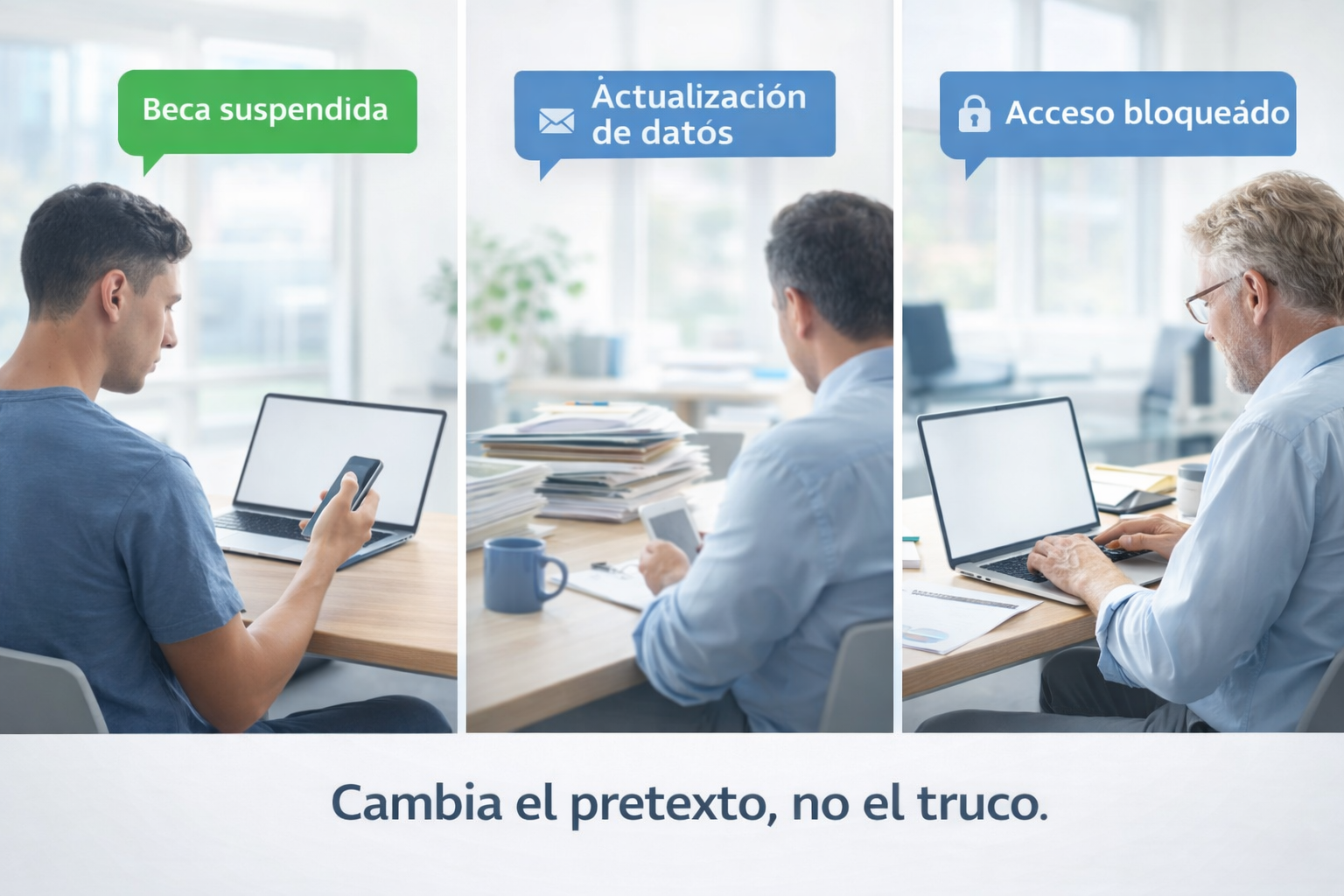 En un entorno universitario esto importa mucho. Un estudiante puede caer por un supuesto pago de matrícula o beca. Una persona del PAS, por una actualización administrativa. Un miembro del PDI, por un aviso de acceso bloqueado o por una supuesta validación urgente de una cuenta. Cambia el pretexto, no el truco.