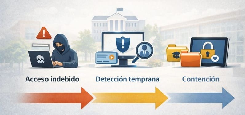 Lo más peligroso es la invisibilidad: la Universidad puede no detectar ninguna anomalía durante semanas. El acceso indebido no siempre genera errores técnicos; el correo funciona, el campus virtual está activo y la actividad diaria prosigue. Sin embargo, en segundo plano, se ha exfiltrado una copia de información sensible que nunca debió abandonar nuestros servidores.