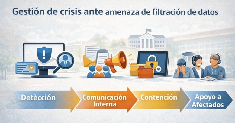 Si, a pesar de las medidas preventivas, se produce una filtración o una amenaza creíble de publicación, la respuesta debe ser coordinada, profesional y transparente. En ciberseguridad, la improvisación suele agravar el impacto. La Universidad dispone de protocolos de gestión de crisis que integran la comunicación interna, el apoyo legal y el soporte a las personas que puedan verse afectadas.
