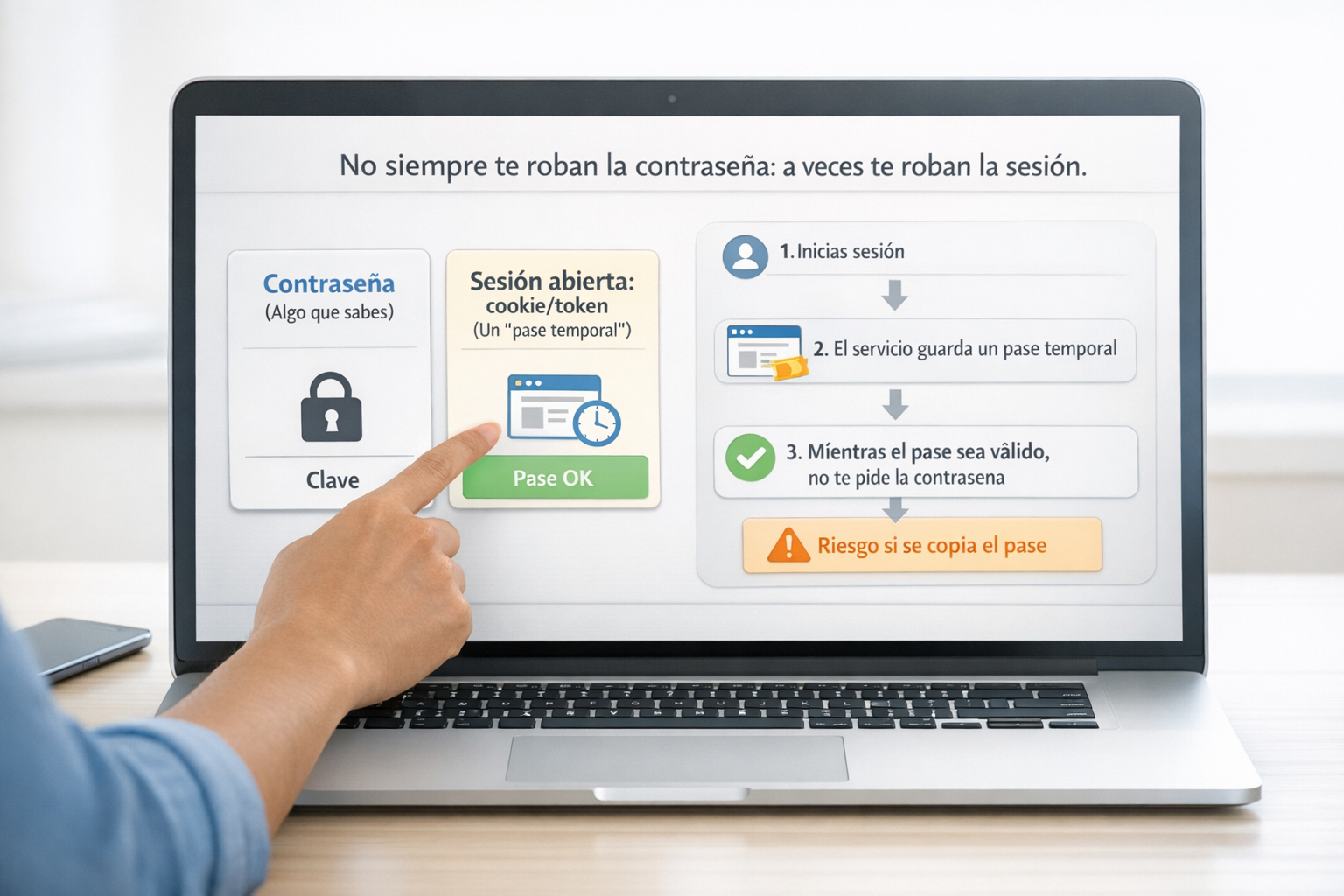 Si un atacante consigue tu cookie o tu token de sesión, puede “seguir dentro” aunque tú no hayas compartido tu contraseña ni veas un inicio de sesión sospechoso a simple vista.