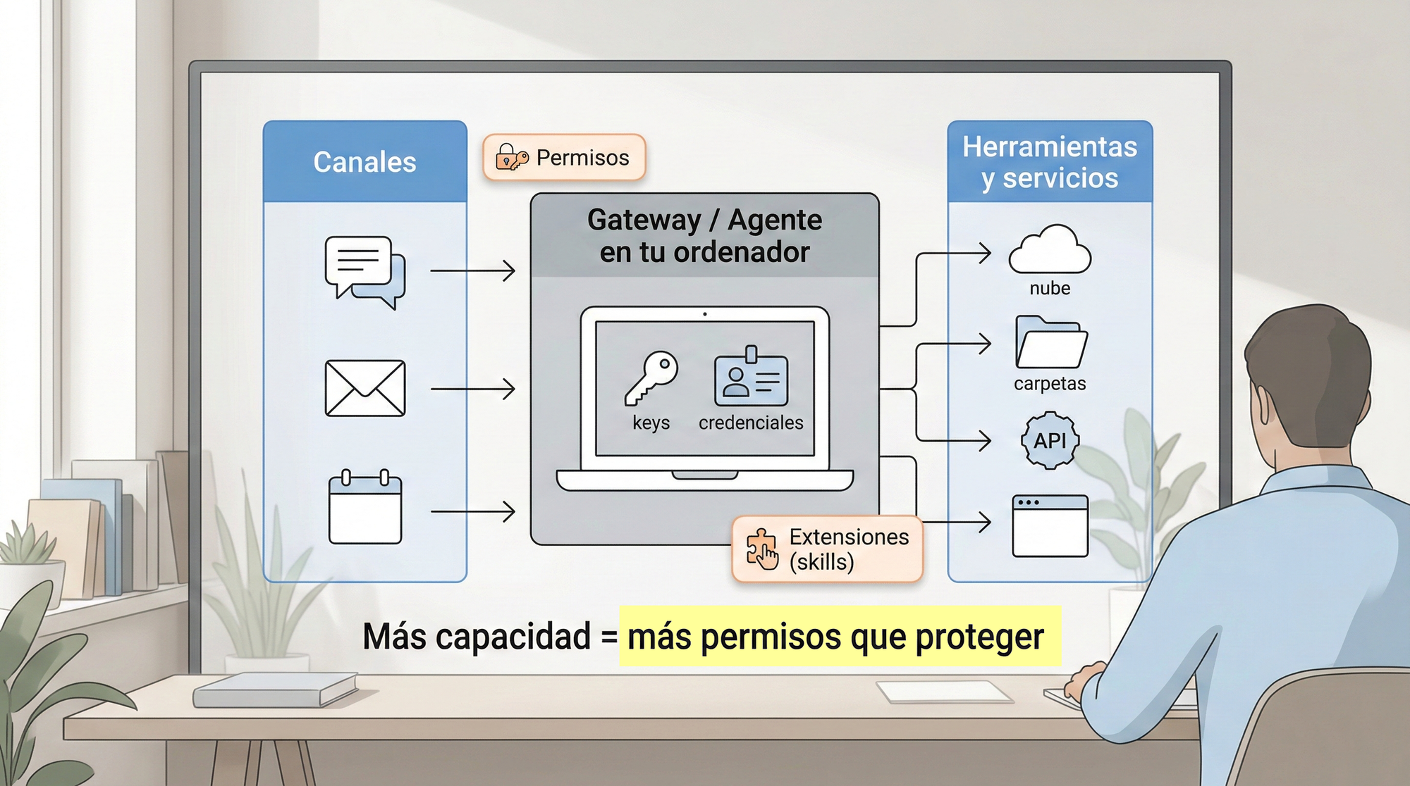 - De “chat” a “agente”: el salto es pasar de responder a actuar. Eso desplaza el foco: ya no importa solo lo que el modelo “dice”, sino lo que el sistema “hace” con permisos reales.