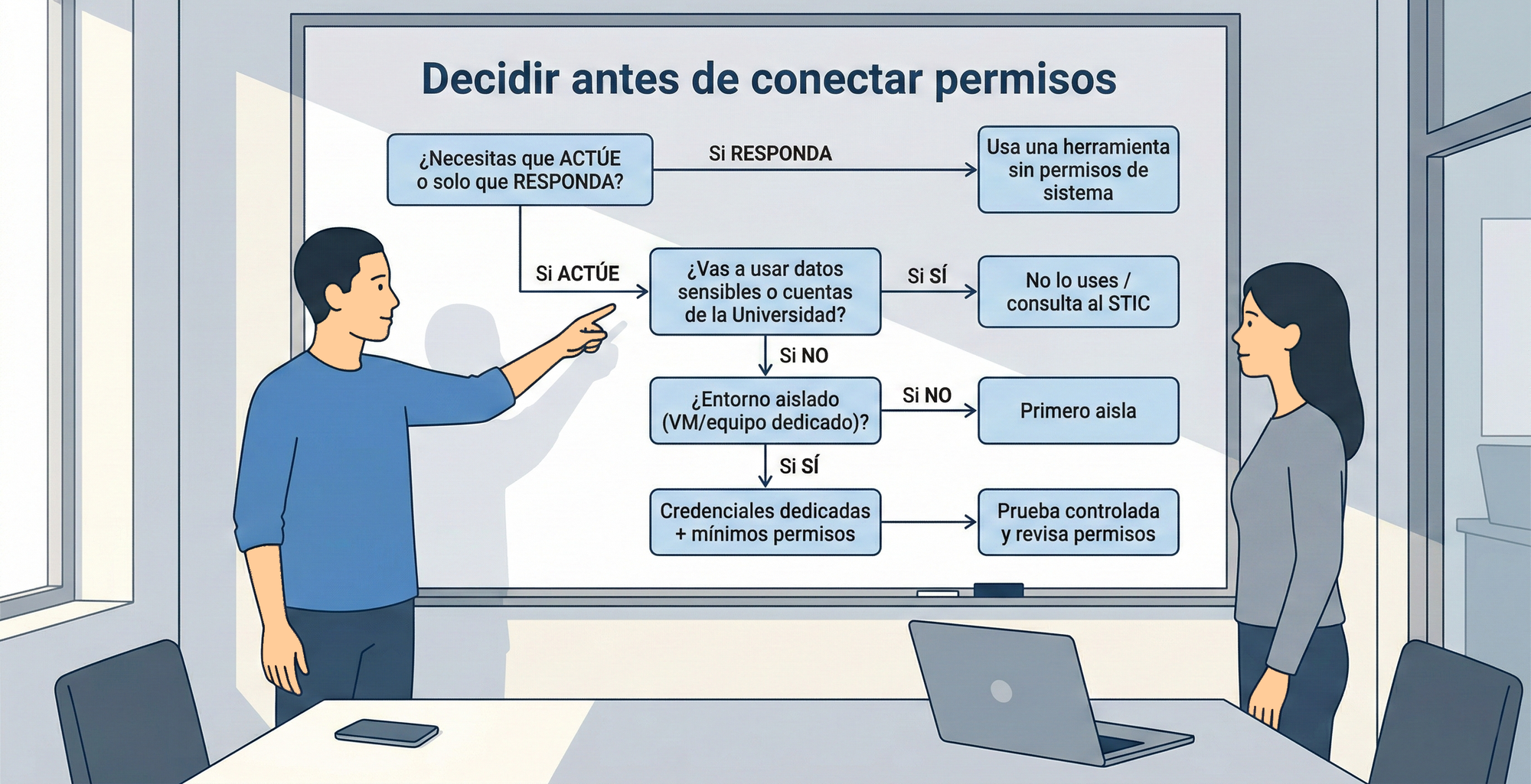 En un entorno universitario, además, los permisos suelen mezclarse: el mismo portátil sirve para preparar material docente, tramitar gestiones, responder tutorías, consultar bibliografía, trabajar con datos de investigación o revisar convocatorias. Es justo esa mezcla la que convierte a herramientas “muy capaces” en herramientas que hay que evaluar con calma y con límites claros.