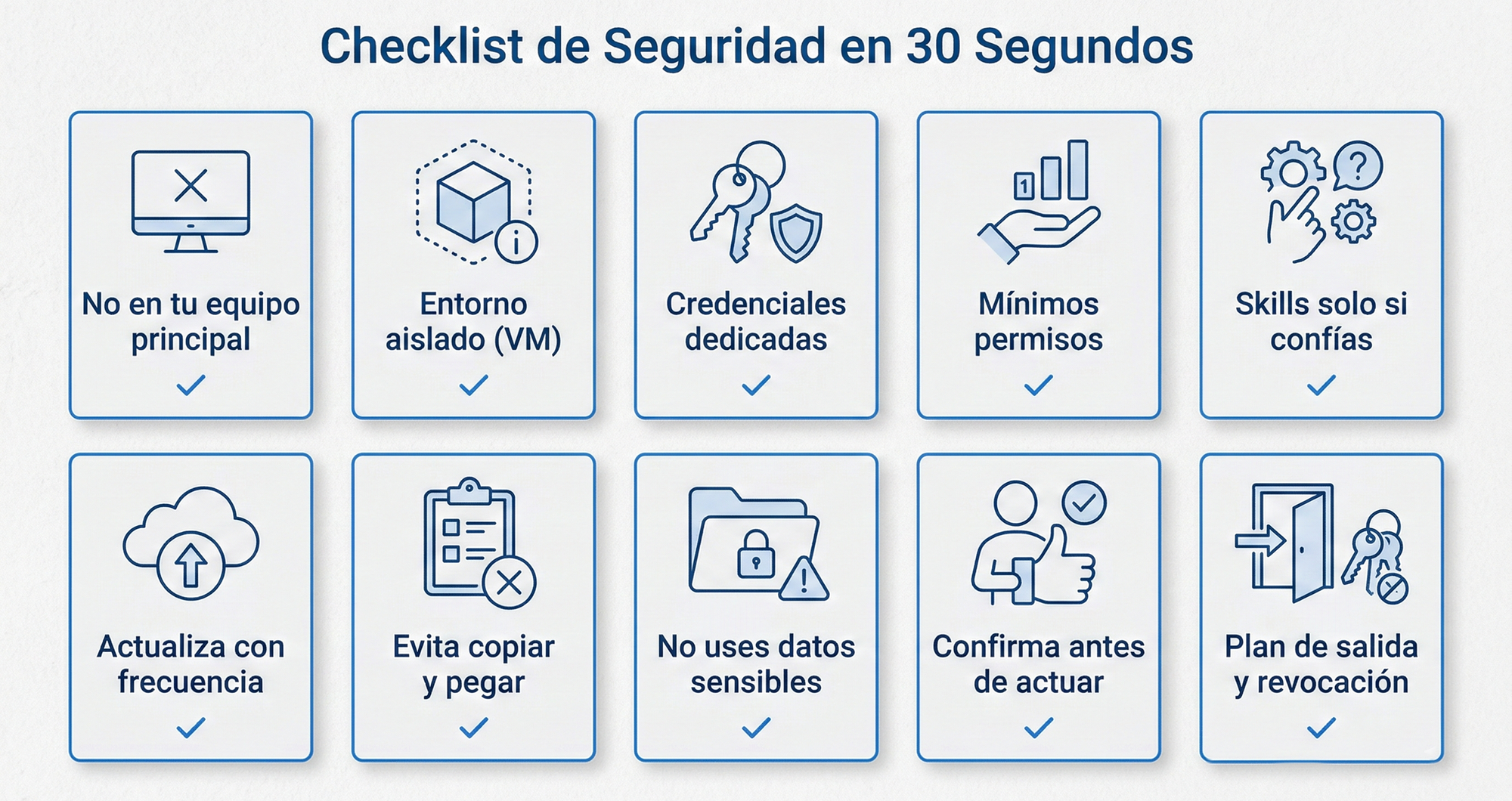 ¿Se puede usar con seguridad? En términos prácticos: se puede evaluar de forma razonablemente controlada si lo tratas como ejecución de código no confiable, lo aislas, limitas credenciales y eres exigente con las skills y con los permisos [Microsoft Security Blog, 2026]. Si lo conectas sin separación a tu correo, tus carpetas y tu trabajo universitario, el margen de error se reduce mucho.